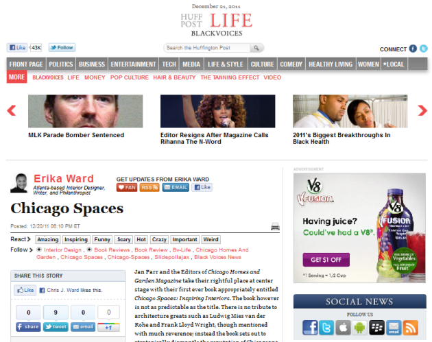 H ey Folks, I’ve got exciting news. If the title of this post didn’t give it away, I’m now blogging for the Huffington Post! My first article was published last night, a book review of Chicago Spaces: Inspiring Interiors by Jan Parr and the Editors of Chicago Home and Garden Magazine. I read the book from cover to cover and it’s safe to say that I’m enamored with the talent that resides in Chicago and outlying suburbs.
